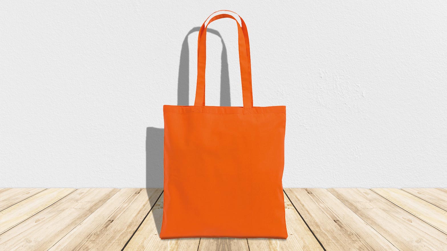 Tote bag riutilizzabile in cotone arancio da 130 gr personalizzabile. Formato 38 (larghezza) x 42 (altezza) cm. Manici lunghi 80 cm. Confezione da 100 shopper. Consegna in 5 giorni neutre e 20 giorni stampate