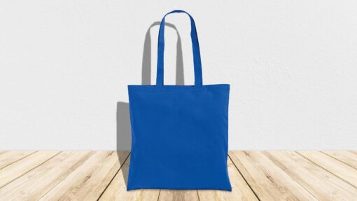 Tote bag riutilizzabile in cotone blu royale da 130 gr personalizzabile. Formato 38 (larghezza) x 42 (altezza) cm. Manici lunghi 80 cm. Confezione da 100 shopper. Consegna in 5 giorni neutre e 20 giorni stampate