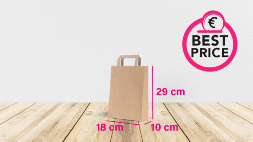 Formato 18x10x29 cm – sacchetto in carta riciclata avana da 110 gr. – stampa a colori da 1 lato – maniglia in carta piatta avana – 1 confezione da 350 shopper a soli 101 € – consegna in 20 giorni