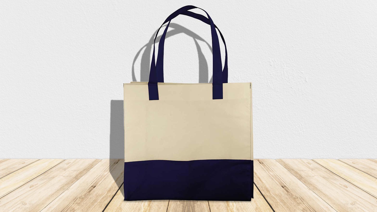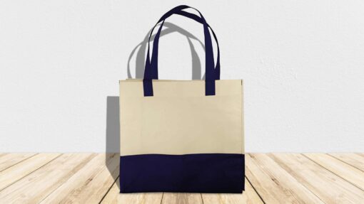 Modello Bicolor – materiale TNT color crema – banda al fondo e manico colore blu – formato 40x13x36 cm – confezione da 100 shopper