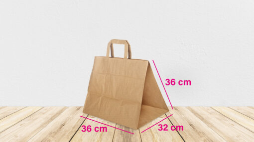 Borsa per Take Away e Delivery in carta avana riciclata da 120 gr personalizzabile. Formato 36 (larghezza) x 36 (profondità) x 36 (altezza) cm. Manici in carta piatta avana. Confezione da 150 shopper. Consegna in 14 giorni neutre e 20 giorni stampate.