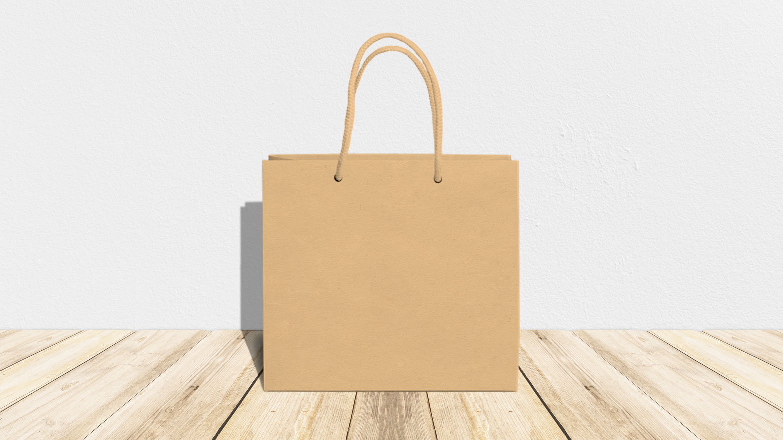 Sacchetto in carta riciclata avana da 180 gr, manico in carta-cotone.