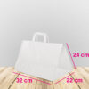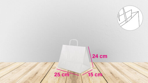 Borsa per Take Away e Delivery in carta bianca da 110 gr personalizzabile. Formato 25 (larghezza) x 15 (profondità) x 24 (altezza) cm. Manici in cordino di carta bianca con risvolto carta superiore. Confezione da 195 shopper. Consegna in 14 giorni neutre e 20 giorni stampate