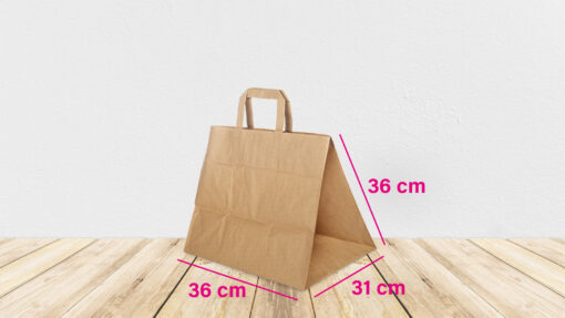 Borsa per Take Away e Delivery in carta avana riciclata da 110 gr personalizzabile. Formato 36 (larghezza) x 31 (profondità) x 36 (altezza) cm. Manici in carta piatta avana. Confezione da 125 shopper. Consegna in 14 giorni neutre e 20 giorni stampate