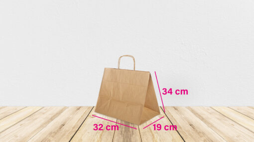 Borsa per Take Away e Delivery in carta avana riciclata da 100 gr personalizzabile. Formato 32 (larghezza) x 19 (profondità) x 34 (altezza) cm. Manici in cordino di carta avana. Confezione da 250 shopper. Consegna in 14 giorni neutre e 20 giorni stampate