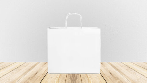 Sacchetto in carta kraft bianca, con manico in carta ritorta bianca.