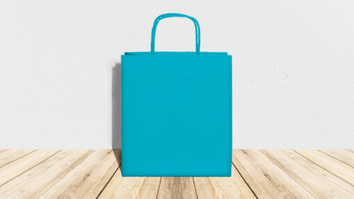 Sacchetto di carta color azzurro, manico di carta ritorta in coordinato.