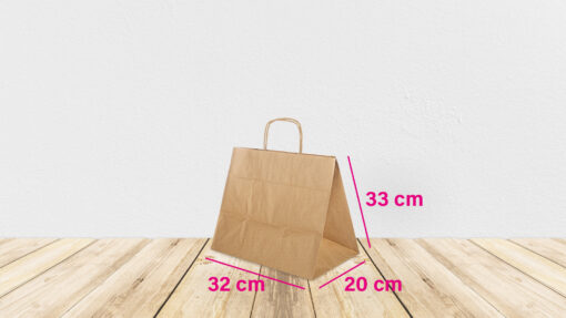 Borsa per Take Away e Delivery in carta avana riciclata da 110 gr personalizzabile. Formato 32 (larghezza) x 20 (profondità) x 33 (altezza) cm. Manici in cordino di carta avana. Confezione da 150 shopper. Consegna in 14 giorni neutre e 20 giorni stampate