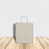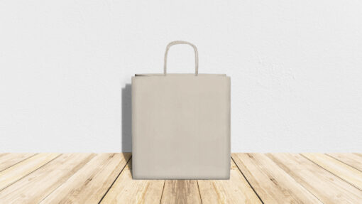 Modello Twisted Sand – carta ricicalata certificata FSC da 110 gr. – interno avana e esterno sabbia – maniglia ritorta color sabbia – formato 36x12x41 cm – confezione da 150 shopper
